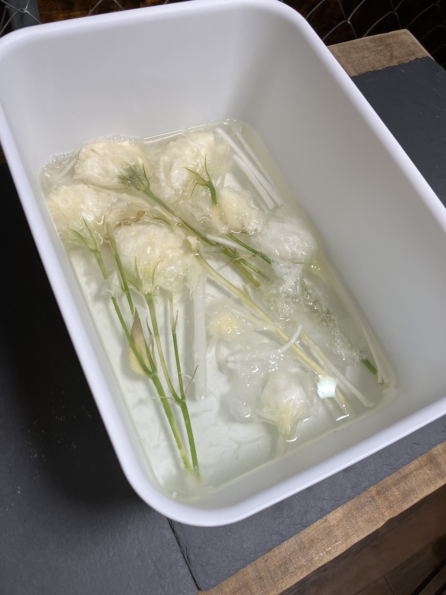酸素系溶剤に花を漬け、火を使わずに植物繊維を分解・軟化する