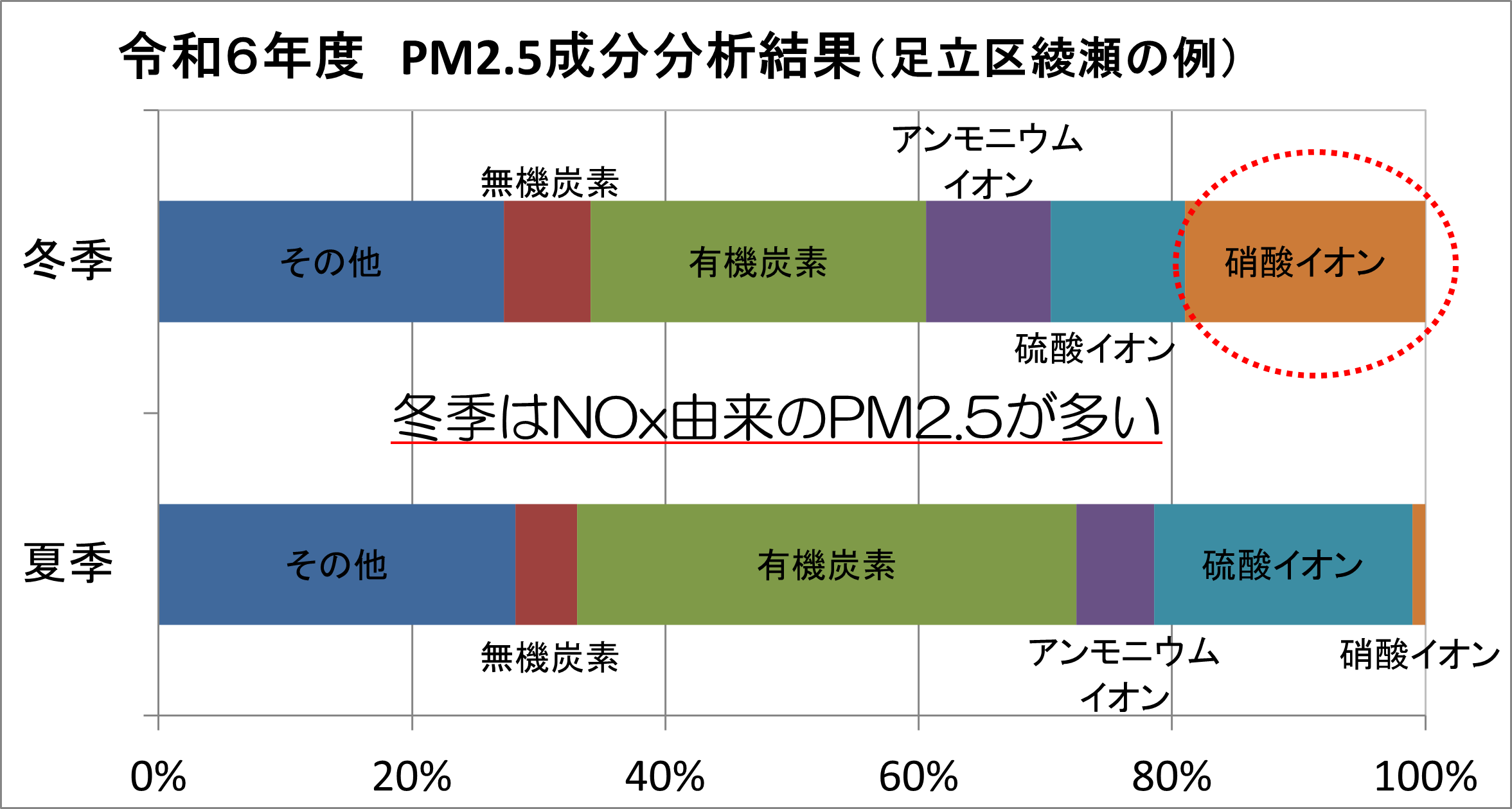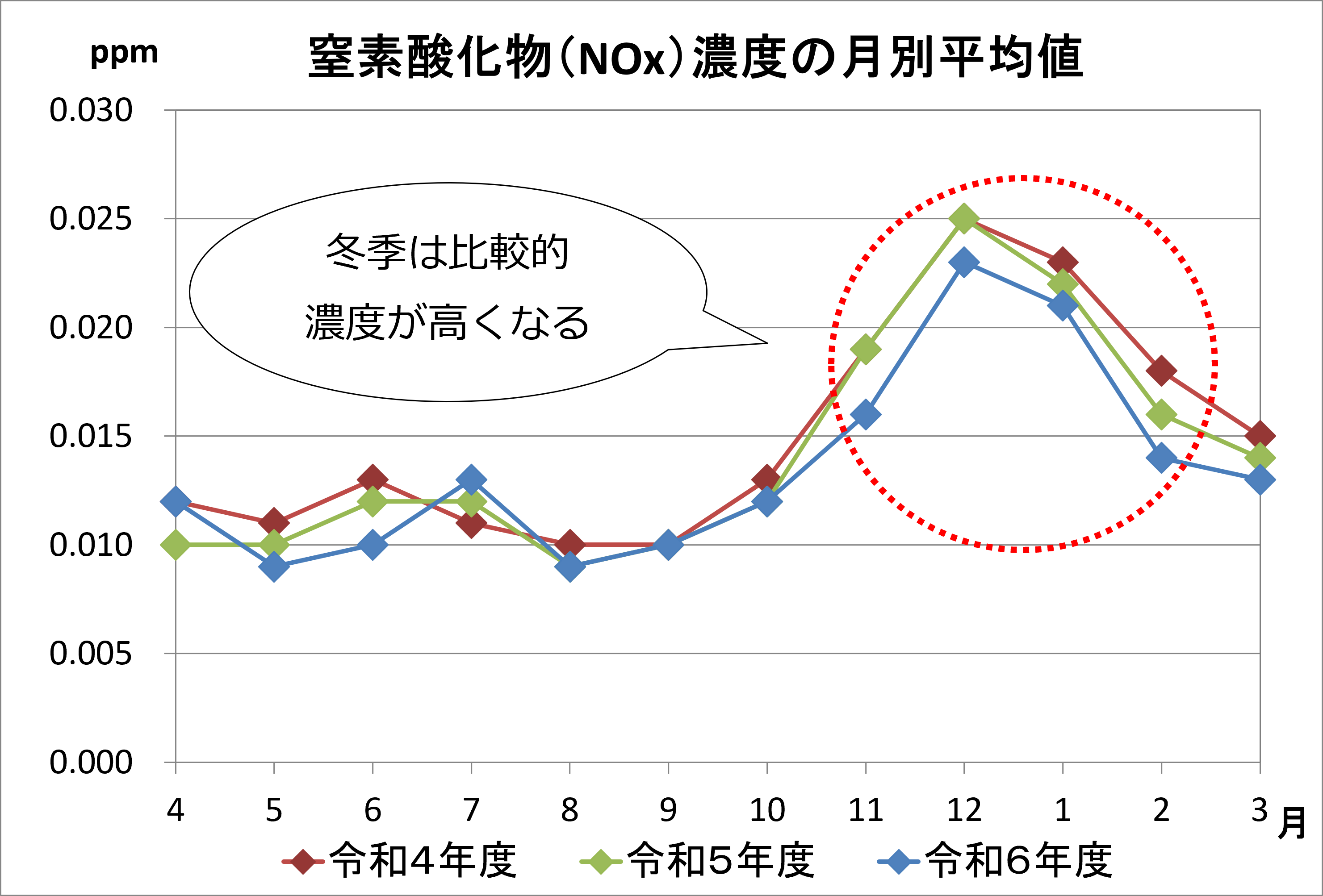東京の大気環境は、都民・事業者の取組により改善が進んでいますが、冬季は局地的に大気がよどみやすく、微小粒子状物質(PM2.5)の原因物質でもある窒素酸化物(NOx)等の大気汚染物質の濃度が高くなります。