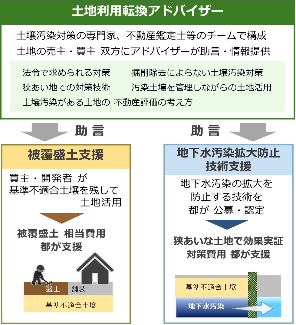 東京都では、令和5年度から 中小事業者による円滑な土地利用の転換 と 持続可能な土壌汚染対策の推進 を目的として、土壌汚染がある工場跡地等において掘削除去によらない対策を行う土地所有者等を、技術・費用の双方から支援する事業を行っています。