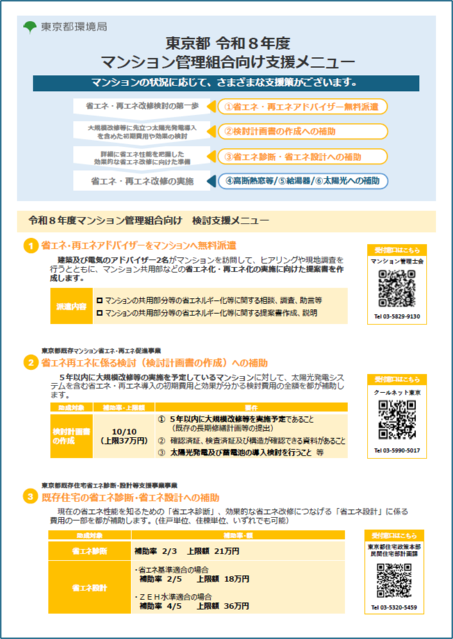 | マンション向け省エネ・再エネアドバイザー派遣 | 建築及び電気のアドバイザー2名がマンションを訪問してヒアリングや現地調査を行うとともに、省エネ化・再エネ化の実施に向けた提案書を作成します。 | 一般社団法人東京都マンション管理士会 電話 03-5829-9130 |