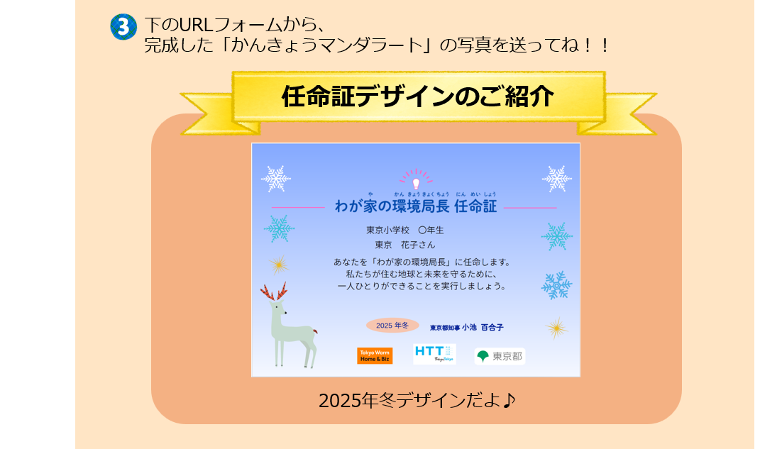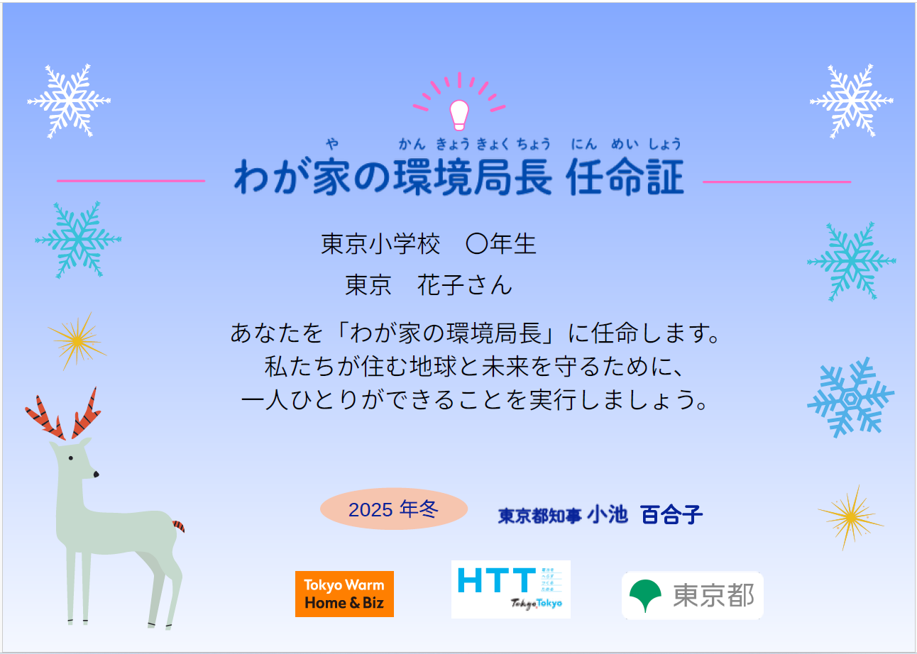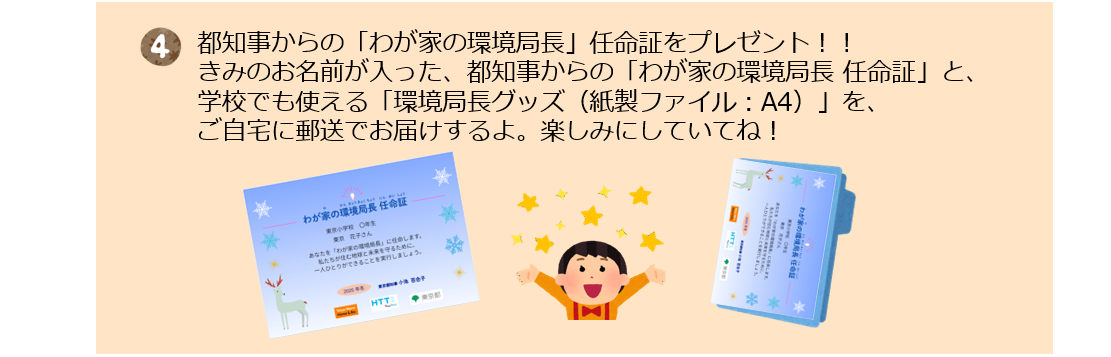 家族で取り組むアクションの内容を送って、都知事からの「わが家の環境局長 任命証」と学校でも使える「環境局長グッズ」を手に入れよう!