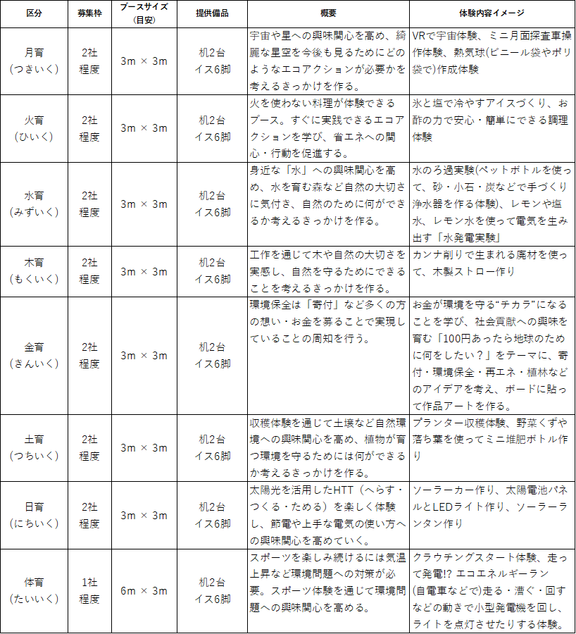「ミライ探究フェスタ」では、環境・エネルギー・テクノロジー・食・宇宙・科学(化学)・身体活動(スポーツ/健康) など、8つの“育”(月育、火育、水育、木育、金育、土育、日育、体育)のテーマごとに、こどもたちの探究心を刺激する多彩な体験プログラムを募集します。