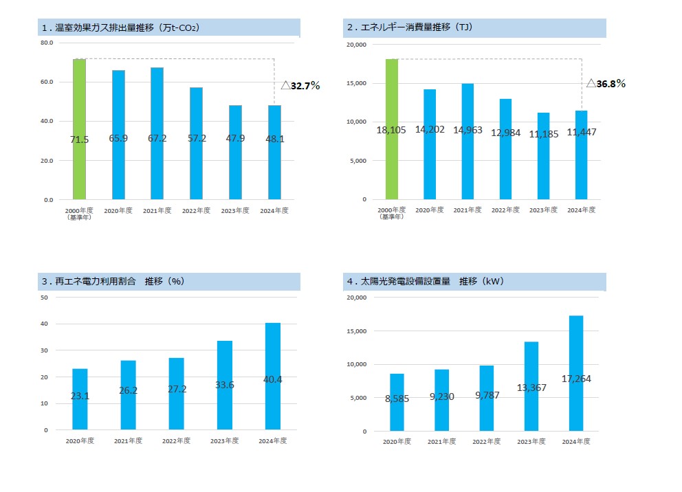 2024年度の温室効果ガス排出量※2については、基準年である2000年度に比べて32.7%の減、2024年度のエネルギー消費量は、2000年度に比べて36.8%の減、再エネ電力利用割合は40.4%、太陽光発電設置量は17,264kWとなりました。