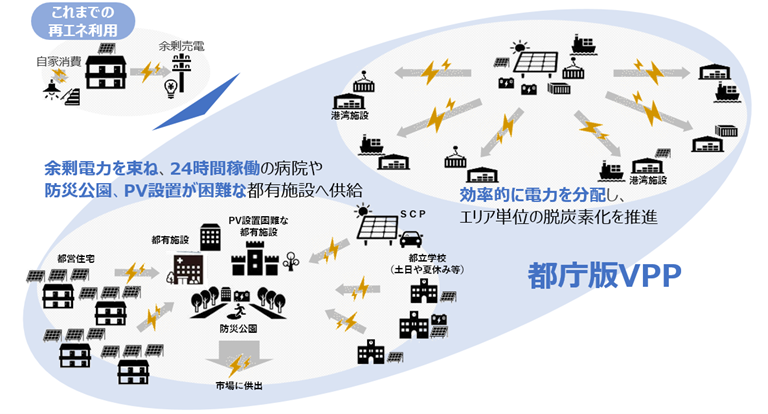 東京都では、電力の使い方が多種多様な都有施設において、太陽光発電設備や蓄電池設備などを設置し、これらを束ねて最適運転を行う、都庁版VPPの構築を進めています