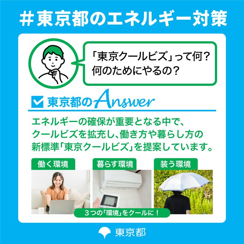 「東京クールビズ」では、こうした状況を踏まえ、「涼しさ」だけでなく、エネルギーを賢く使う(=クール)という視点から、時期や服装にとどまらない働き方や暮らし方の新しい標準を、都民や事業者の皆様に提案していきます。