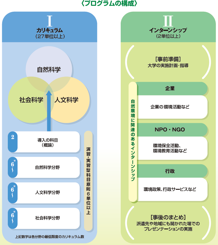 授業やインターンシップなどを通じて、大学、企業、NPO、行政が連携して自然環境に軸足を置いたジェネラリストを育てます。