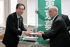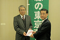 - 株式会社東京都民銀行様、株式会社東日本銀行様、株式会社八千代銀行様から、昨年度に引き続き4回目のご寄附をいただきました。 これは、3行がCSR活動の一環として共同で平成23年4月1日から9月30日までに販売した第4回「東京緑の定期」預金の預金残高の一定割合をご寄附いただいたものです。募金は、「緑の東京募金」各事業に使わせていただきます。ありがとうございました。