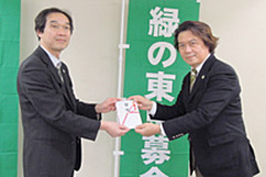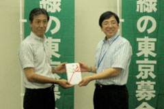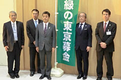 - 株式会社東京都民銀行様、株式会社東日本銀行様、株式会社八千代銀行様から、昨年度に引き続き5回目のご寄附をいただきました。これは、3行がCSR活動の一環として共同で平成24年4月2日から9月28日までに販売した第5回「東京緑の定期」預金の預金残高の一定割合をご寄附いただいたものです。募金は、「緑の東京募金」各事業に使わせていただきます。ありがとうございました。