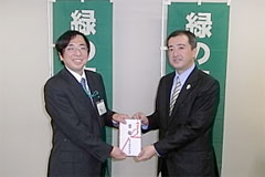 - 興産信用金庫様が「エコグリーン定期預金」の預金残高の一定割合(0.05%)に相当する金額を緑の東京募金へご寄附いただきました。「エコグリーン定期預金」は、興産信用金庫様がCSR活動の一環として、緑の東京募金に協力するために発売した定期預金で、通常の期間1年の「スーパー定期」及び「スーパー定期300」の店頭表示金利に+0.05%金利を上乗せしたものです。ご協力ありがとうございました。