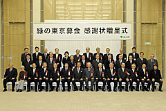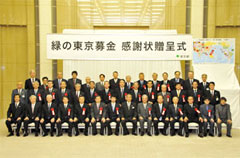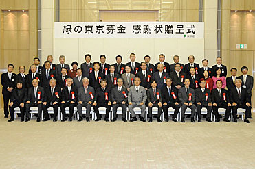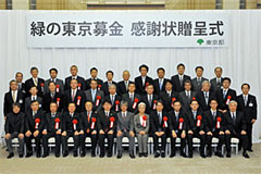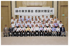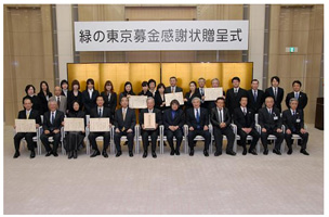 緑の東京募金に功績のあった方に感謝の意を表するため、「緑の東京 募金感謝状制度」を創設いたしました。知事賞は募金額300万円以上の団体または100万円以上の個人の方へ、局長賞は募金額100万円以上300万円未 満の団体または30万円以上100万円未満の個人の方へ、特別賞は緑の東京募金に特に貢献が認められた方へ贈られます。