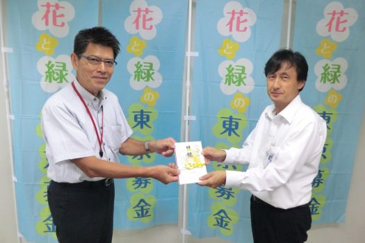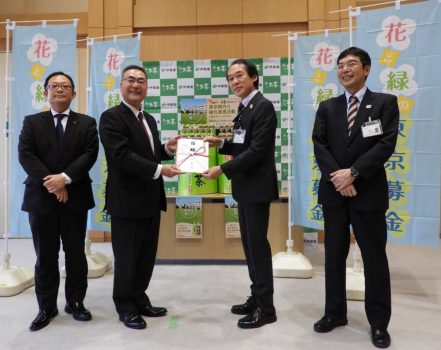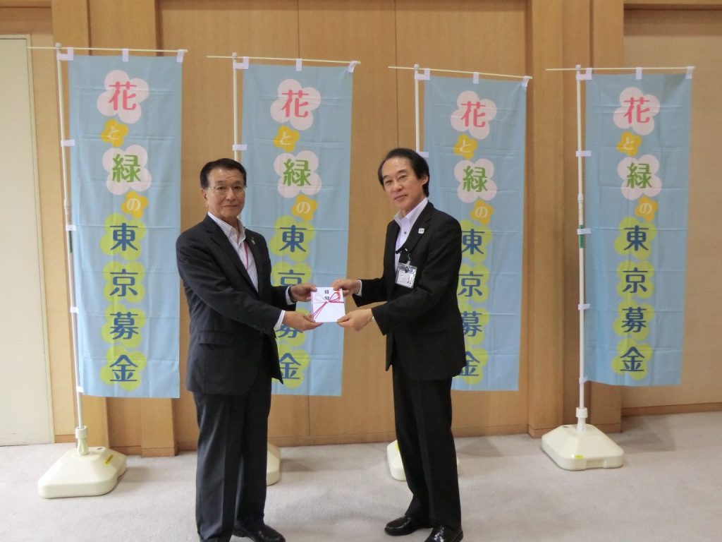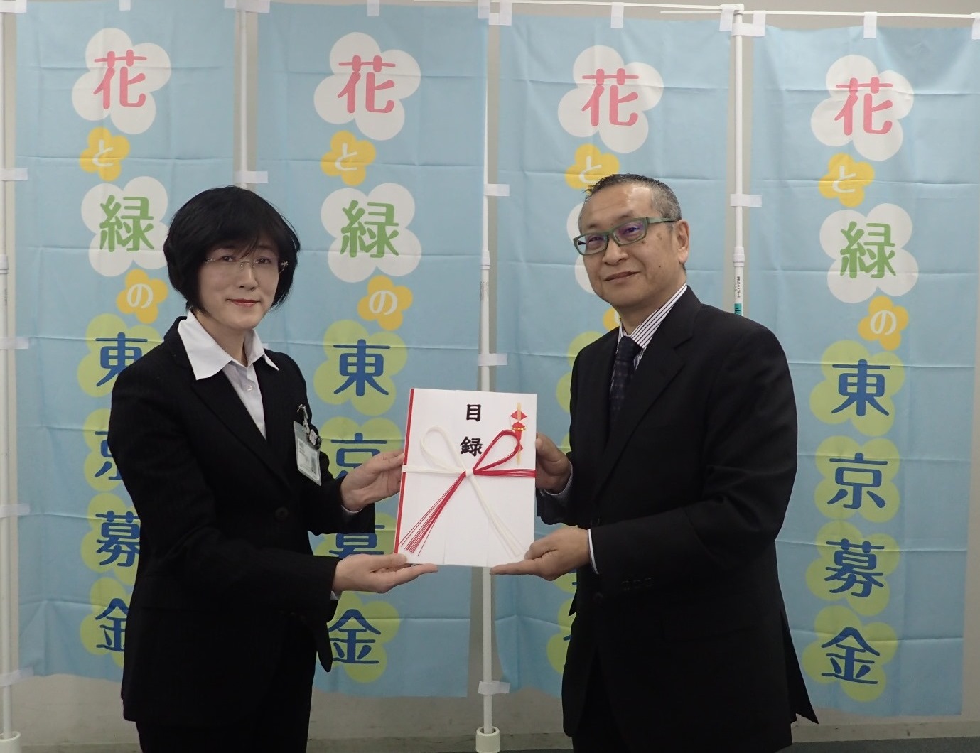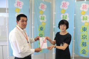 このたび、チャリティバザー収益金の一部を「花と緑の東京募金」に御寄附いただきました。御寄附をいただくのは、「緑の東京募金」の時から引き続き、今回で8回目となります。