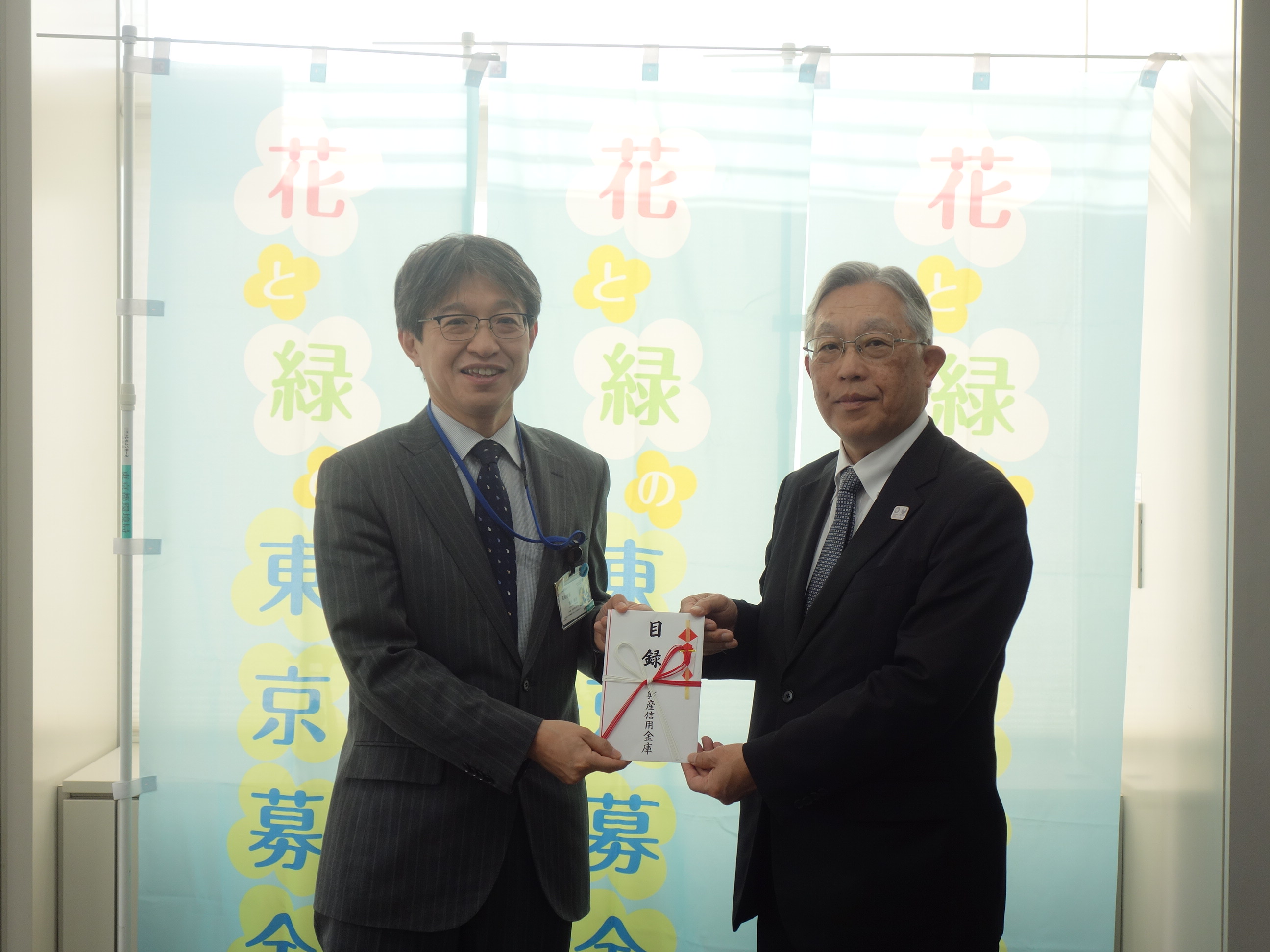 興産信用金庫様から「エコグリーン定期預金」の成果を御寄附いただきました。東京の緑を増やすために、興産信用金庫様が販売する「エコグリーン定期預金」の預金残高の0.02%に相当する金額を「花と緑の東京募金」に御寄附いただく取組で、御寄附をいただくのは「緑の東京募金」の時から通算して、今回で12回目となりました。御協力ありがとうございました。