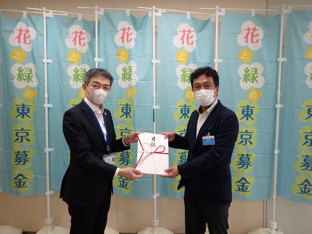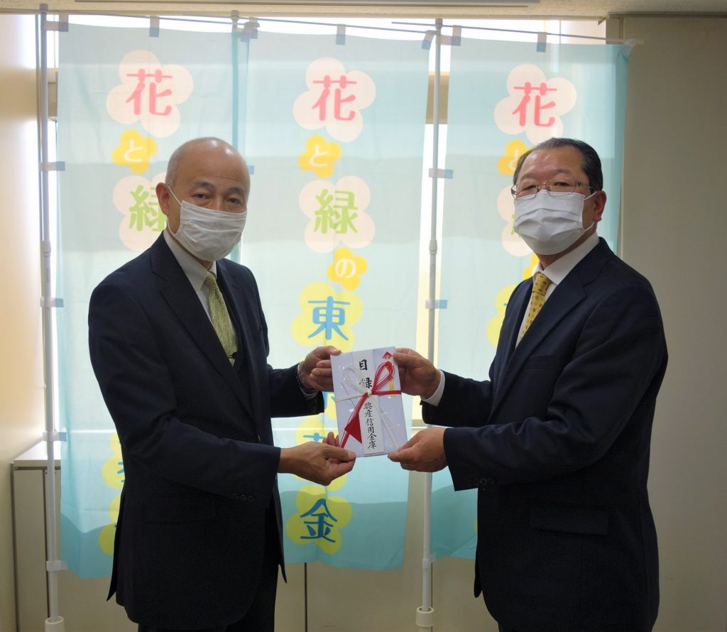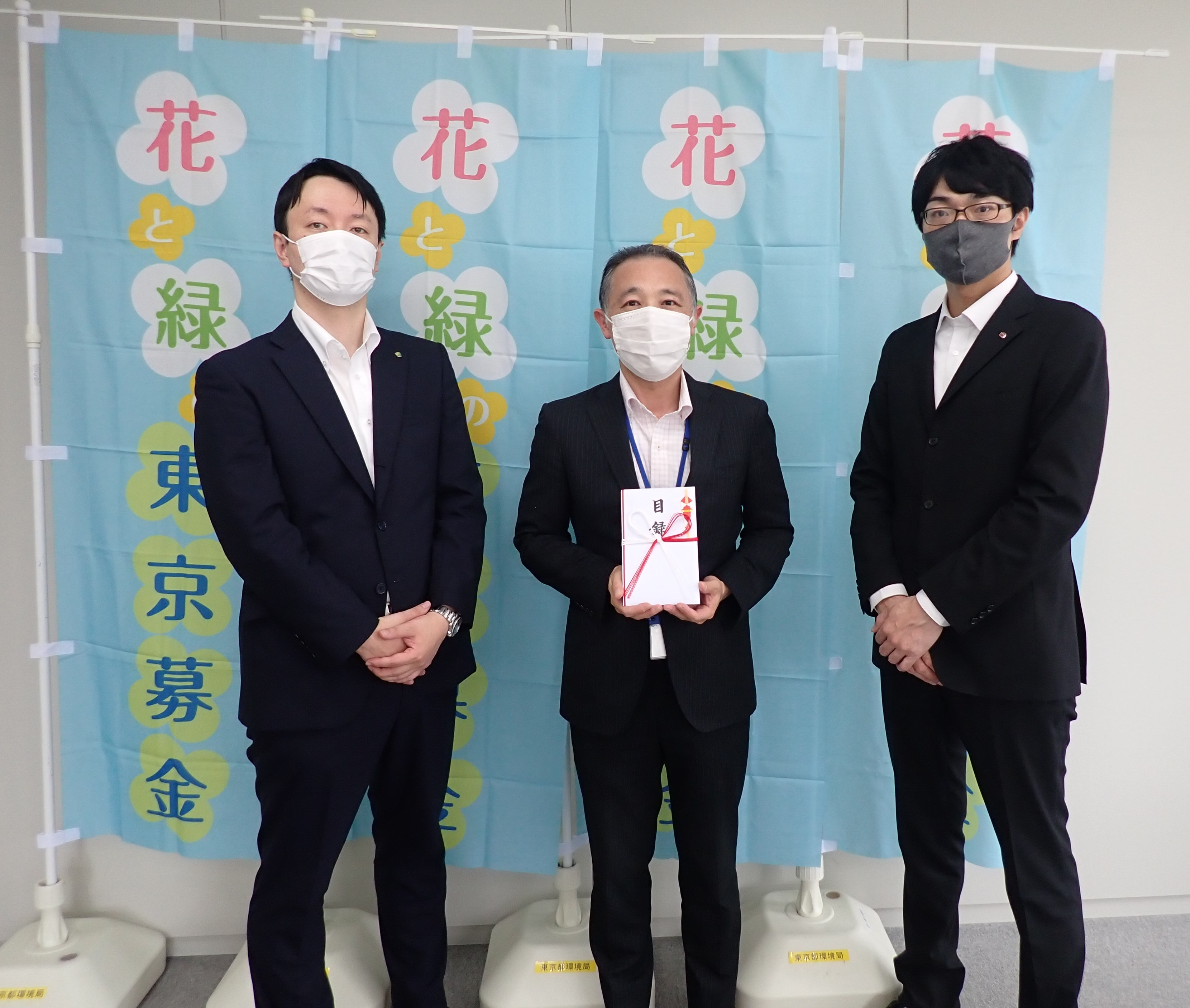 興産信用金庫様から「エコグリーン定期預金」の成果を御寄附いただきました。東京の緑を増やすために、興産信用金庫様が販売する「エコグリーン定期預金」の預金残高の0.01%に相当する金額を「花と緑の東京募金」に御寄附いただく取組で、御寄附をいただくのは「緑の東京募金」の時から通算して、今回で13回目となりました。御協力ありがとうございました。