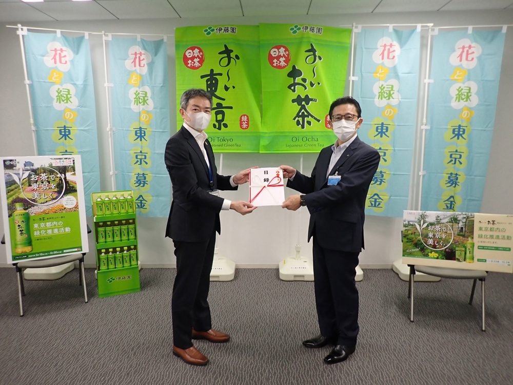 このたび、キャンペーン期間中の「お~いお茶」の売上の一部を、「花と緑の東京募金」に御寄附いただきました。この御寄附は、「花と緑のおもてなし」と「花粉の少ない森づくり」に活用させていただきます。御協力ありがとうございました。