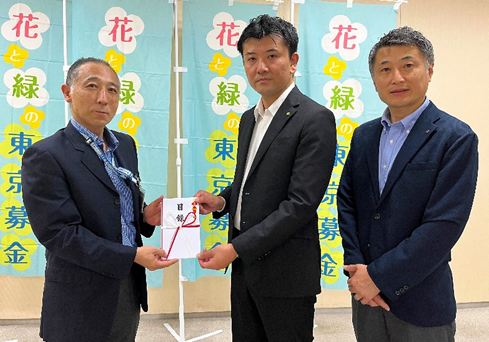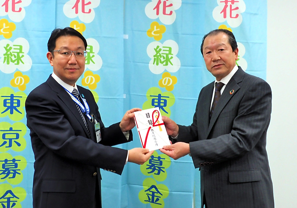 興産信用金庫様から「エコグリーン100定期預金」の成果を御寄附いただきました。東京の緑を増やすために、興産信用金庫様が創立100周年を記念して販売された「エコグリーン100定期預金」の預金残高の0.02%に相当する金額を「花と緑の東京募金」に御寄附いただく取組で、御寄附をいただくのは「緑の東京募金」の時から通算して、今回で15回目となりました。御協力ありがとうございました。