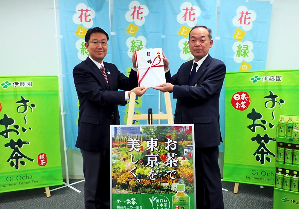 このたび、キャンペーン期間中の「お~いお茶」の売上の一部を、「花と緑の東京募金」に御寄附いただきました。この御寄附は、「花と緑のおもてなし」と「花粉の少ない森づくり」に活用させていただきます。御協力ありがとうございました。