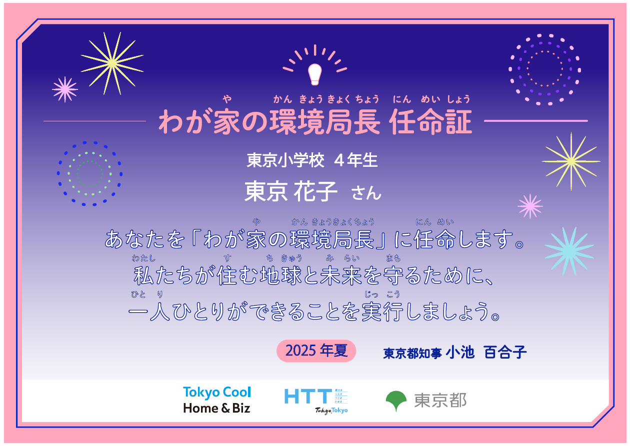 家族で取り組むアクションの内容を送って、都知事からの「わが家の環境局長 任命証」と学校でも使える「環境局長グッズ」を手に入れよう!