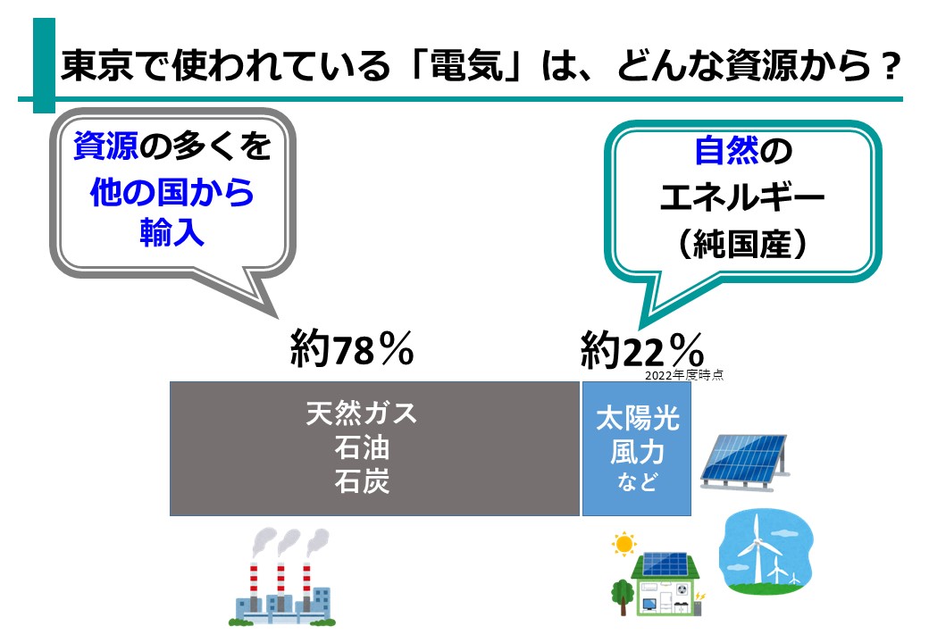 これは、じゅんすいな国産のエネルギー。でも残念ながら東京では、こうした自然の電気はまだ少なくて、22%しかない。