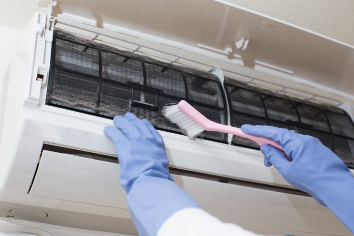 「フィルターそうじ」と言って、ほこりを掃除機ですったり、そのあとでフィルターを水で洗ったりすると、冷たい空気がつくりやすくなって、お部屋が冷えやすくなるうえに、電気を使う量もへらすことができるんだ(冬に、暖房を使うときも一緒だよ!)。