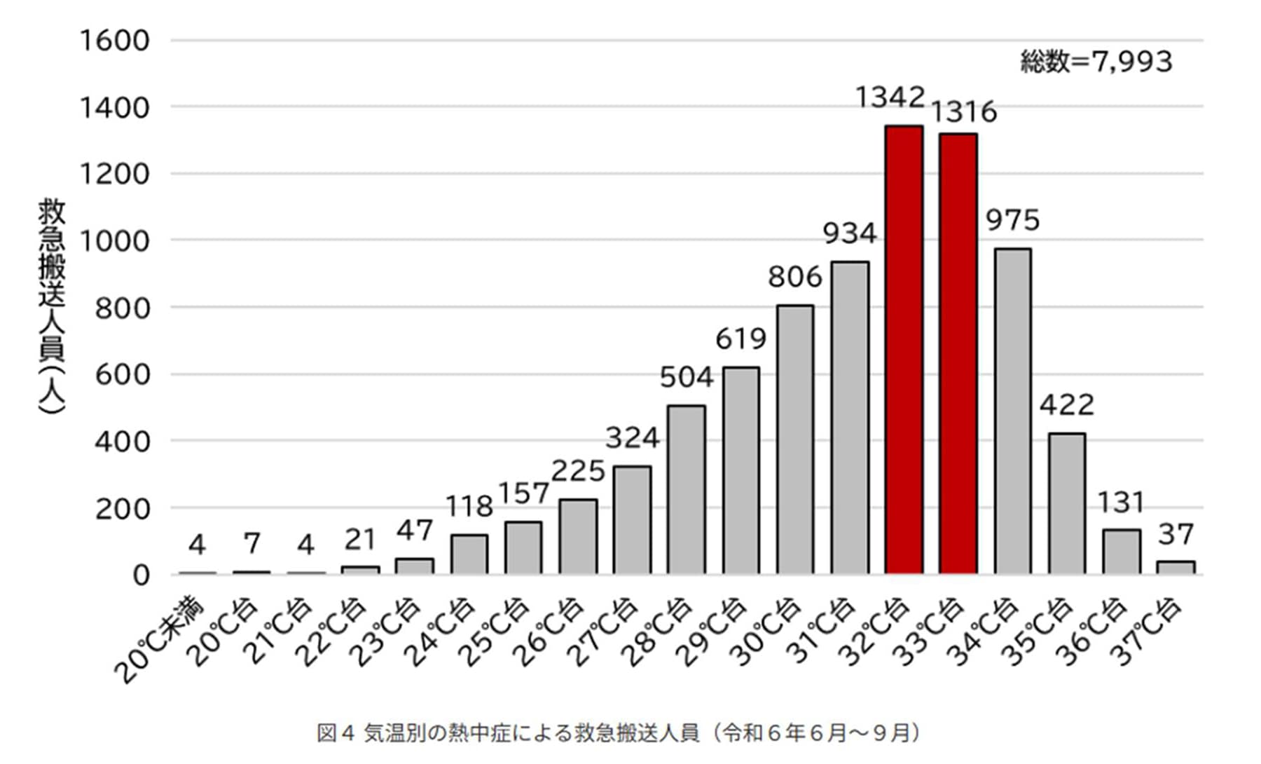 ②気温が「32℃~33℃台」になると大幅に増える。