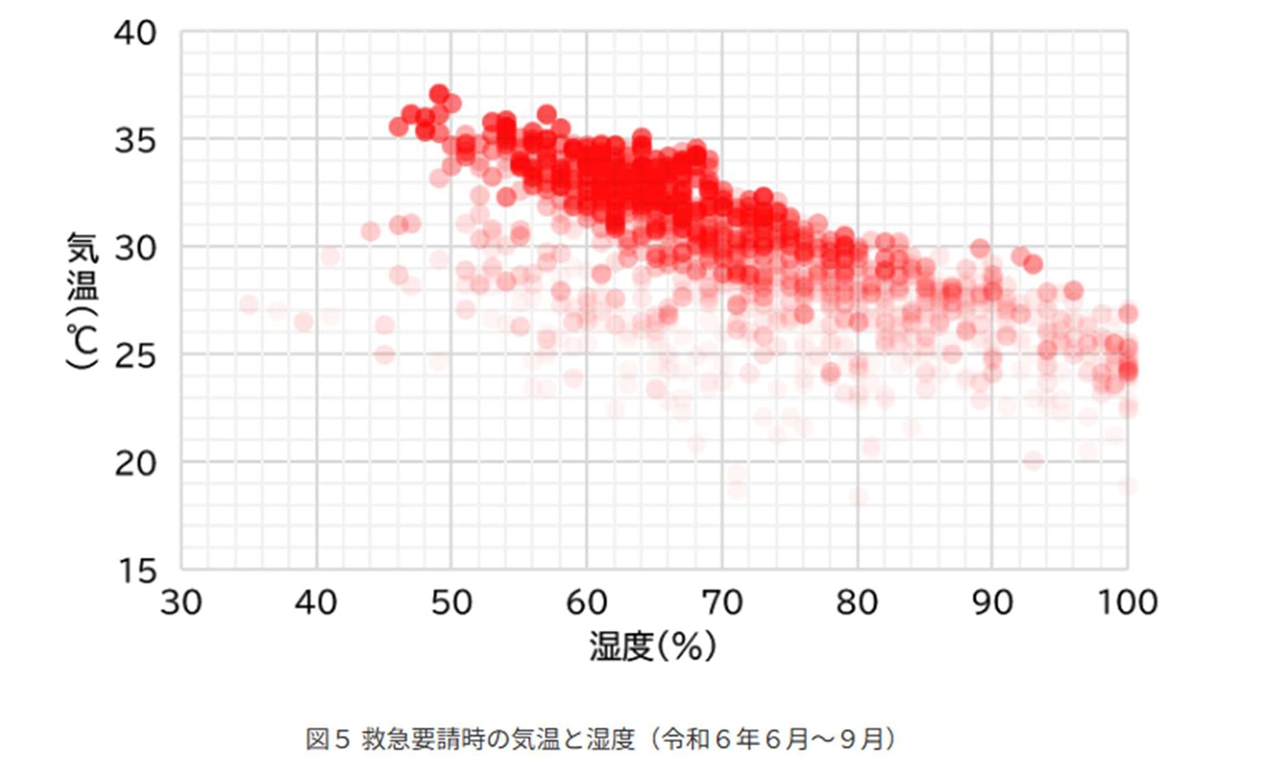 2024年に熱中症で救急搬送された7993人について、「119番」の電話があった時の「気温と湿度」をみると、下の図の赤い色が濃いほど救急車の依頼が多いことがわかるよ。だいたい、気温は28℃から35℃まで、湿度は50%から80%までの時が多い。