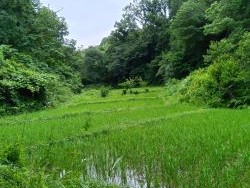 コナラ群落に囲まれた谷戸で、畑地、水田雑草群落、放棄水田雑草群落が混在し、奥部にはオギ群集が小規模ながら存在する。 水田周辺には希少な湿生植物が豊富で、開放的な湿地や浅い池沼を好むトンボ類やカエル類が多く生息している。 |