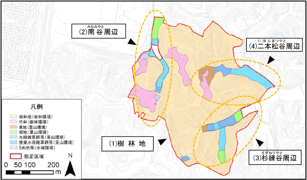 | 4 | 二本松谷周辺 | スギ・ヒノキ・サワラ植林やシイ・カシ二次林に囲まれた谷戸で、主に水田等の湿地環境からなる里山環境が形成されている。 |