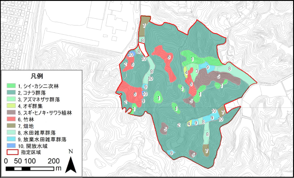| 1 | 樹林地 | コナラ群落が主体の落葉広葉樹林で、シイ・カシの二次林や竹林が点在する。低木には常緑広葉樹がみられる。 また、二本松谷にはスギ・ヒノキ・サワラが植林された樹林地が存在する。 |