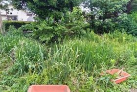学校の敷地内に矢川が流れており、そのわきの湿地帯で今回は「キショウブ」の除去活動を行いました。