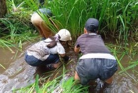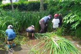 「キショウブ」の根元に手を突っ込んで、一生懸命抜いています。