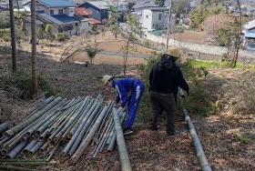 はじめはノコギリの扱いに苦戦する様子も見られましたが、回数を重ねるうちにコツをつかみ、次第に手際よく作業を進めていきました。切り倒した竹は、枝を落としてから一定の長さに切り分け、決められた場所へ集積しました。