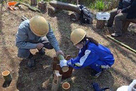 最後に、自分たちで伐採した竹を活用してクラフト体験を行いました。竹は成長が早く、昔から里山環境に無くてはならないものでした。今回はボランティア団体のアドバイスを受けながら、竹製のコップや水盆など皆さん思い思いの作品づくりに取り組みました。