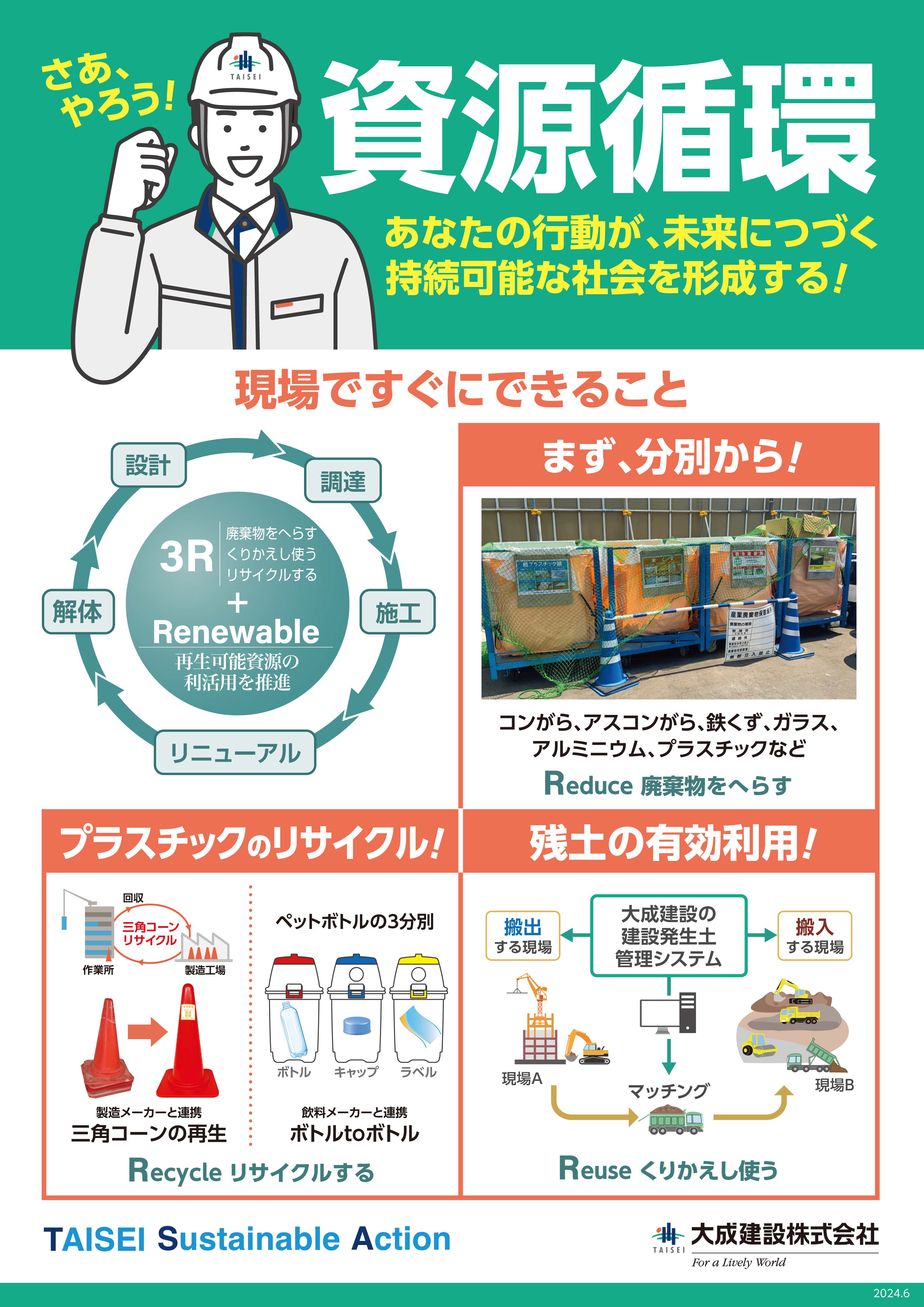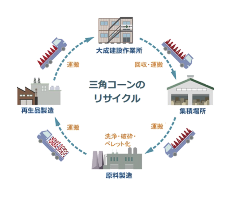 大成建設はプラスチック成形メーカーの株式会社八木熊とともに、2023年10月より建設現場で不要となった三角コーンの再資源化に関する実証試験を開始しました。