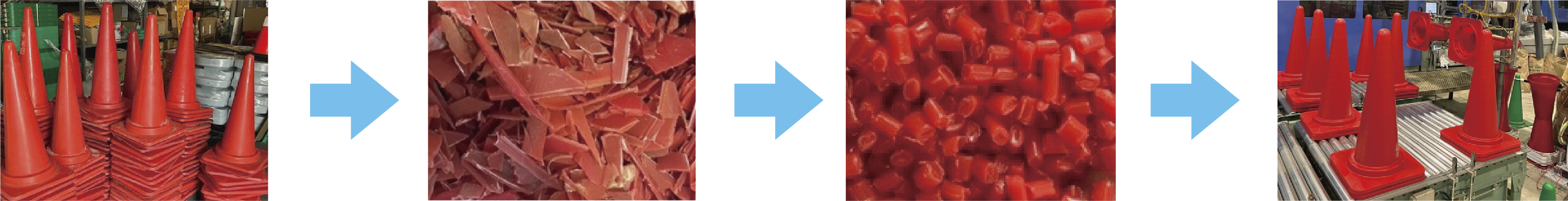 使用済み三角コーン回収 破砕 原料ペレット精製 再生三角コーン製造
