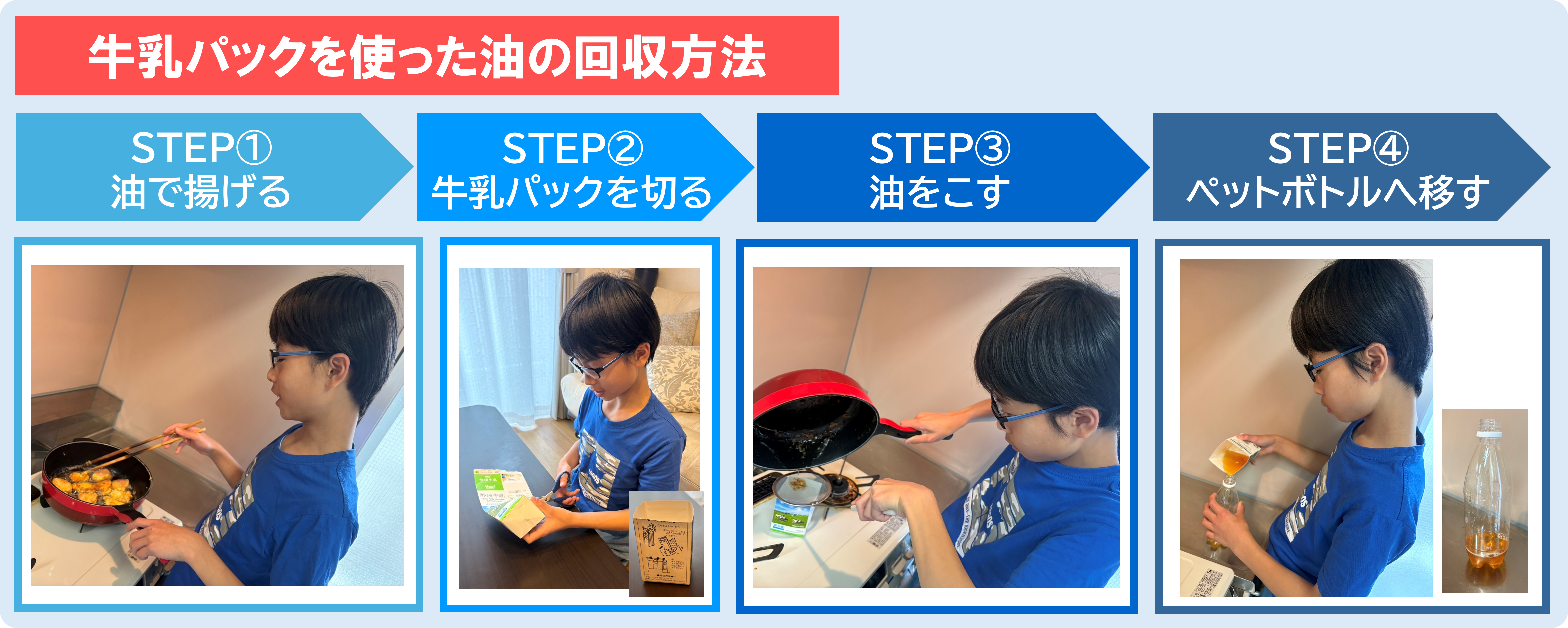 家庭にじょうごがなくても、牛乳パックを使えば簡単に油を回収できます。